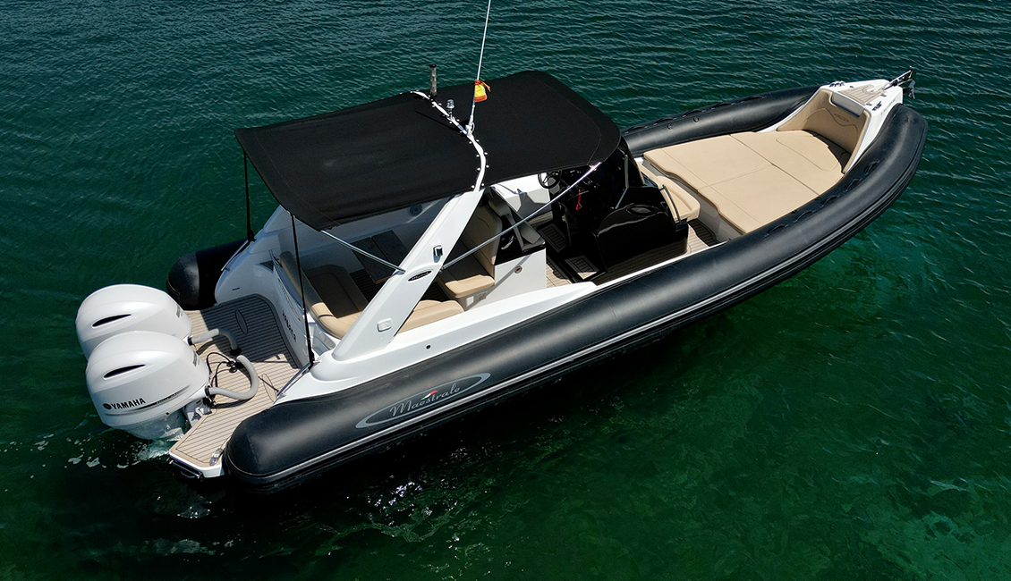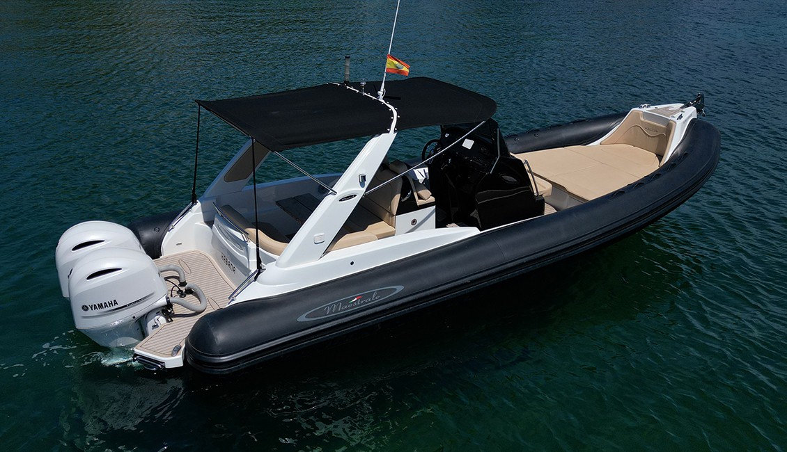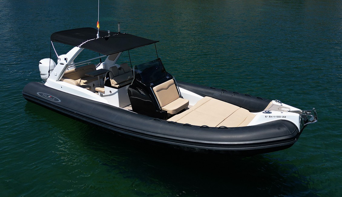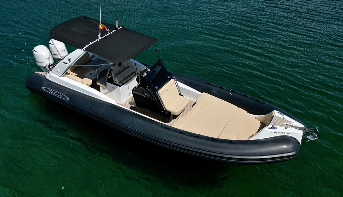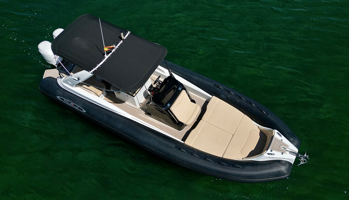 Embarcación semirrígida nueva de 2022 de 8,6 metros de eslora, con amplias zonas de descanso tanto en proa como en popa, muy recomendable para aquellos que quieran disfrutar de la gran comodidad que un barco de este tipo ofrece, muy superior a otras opciones.