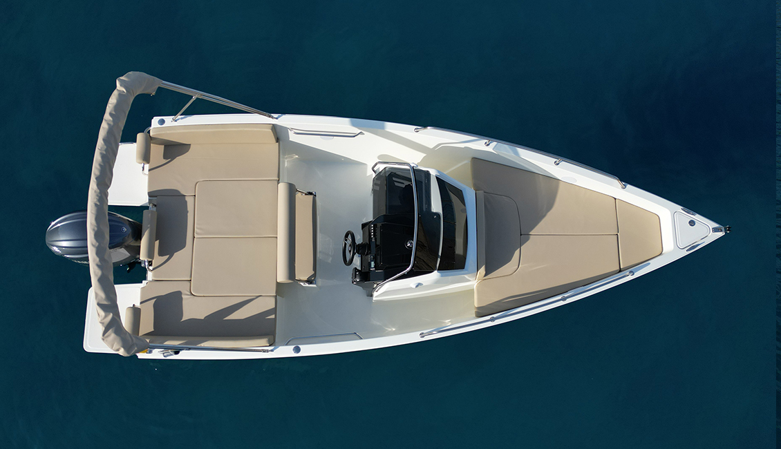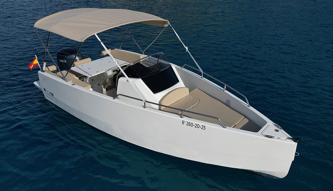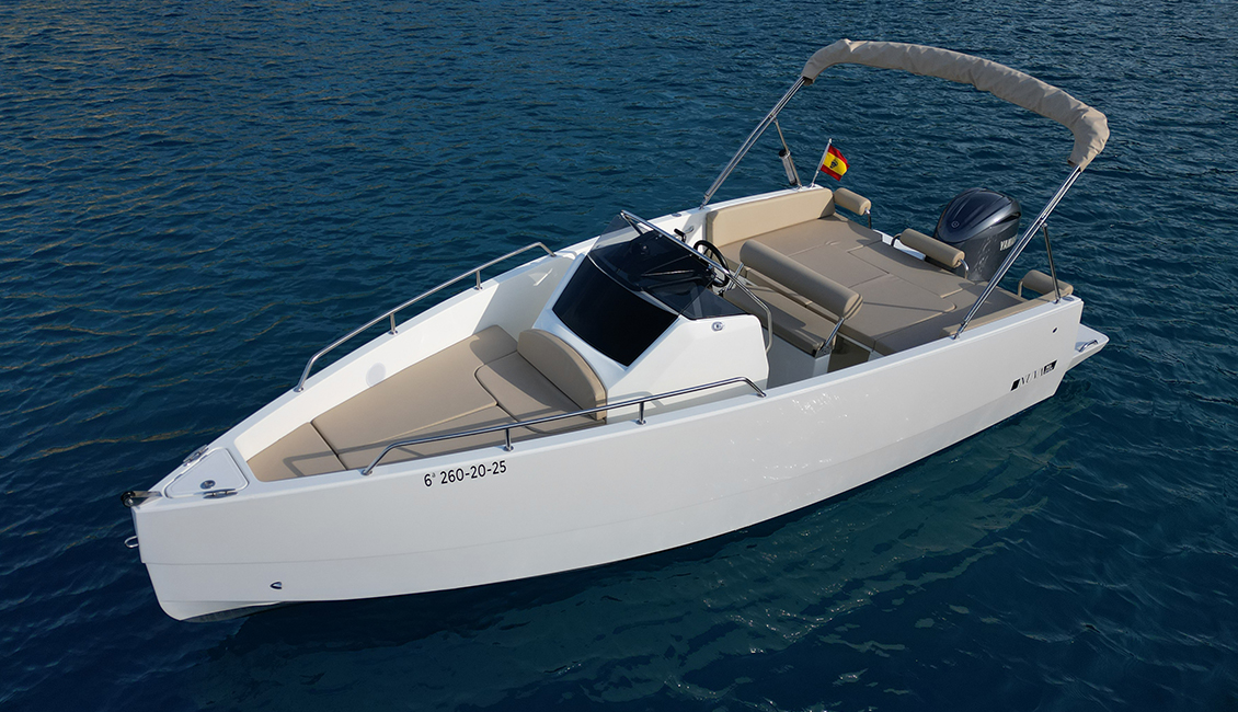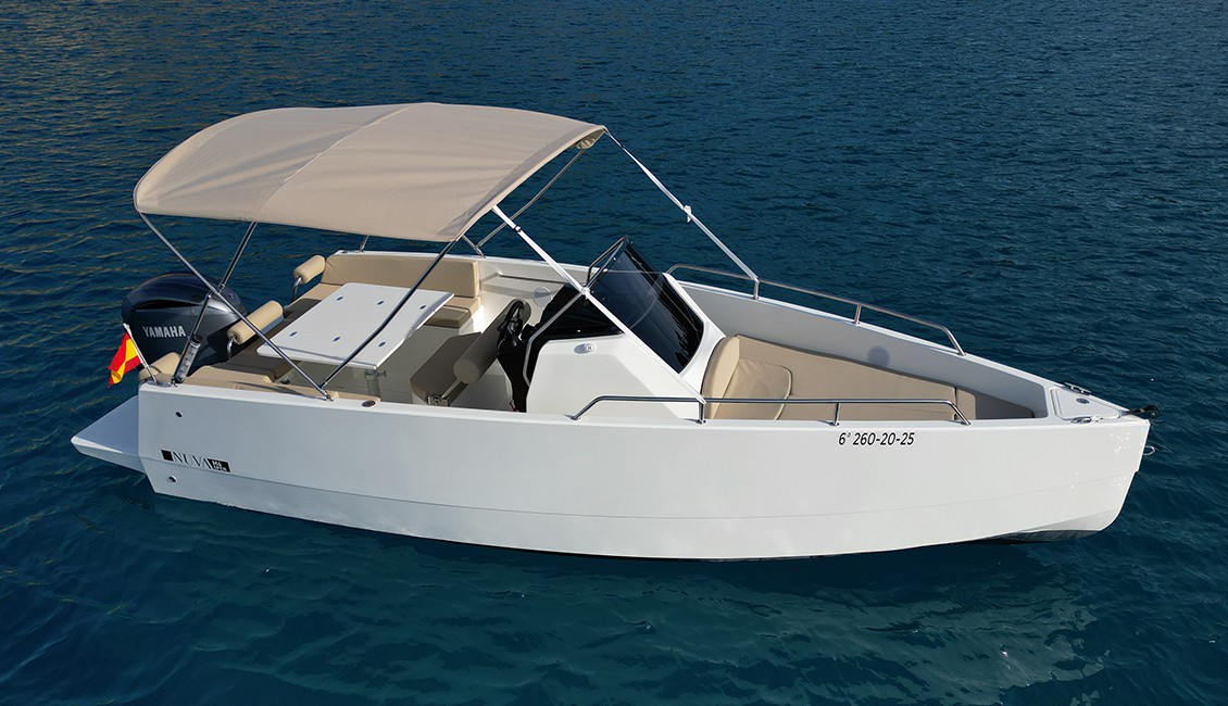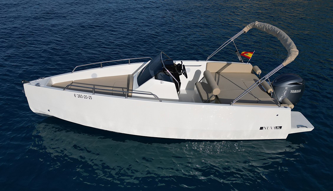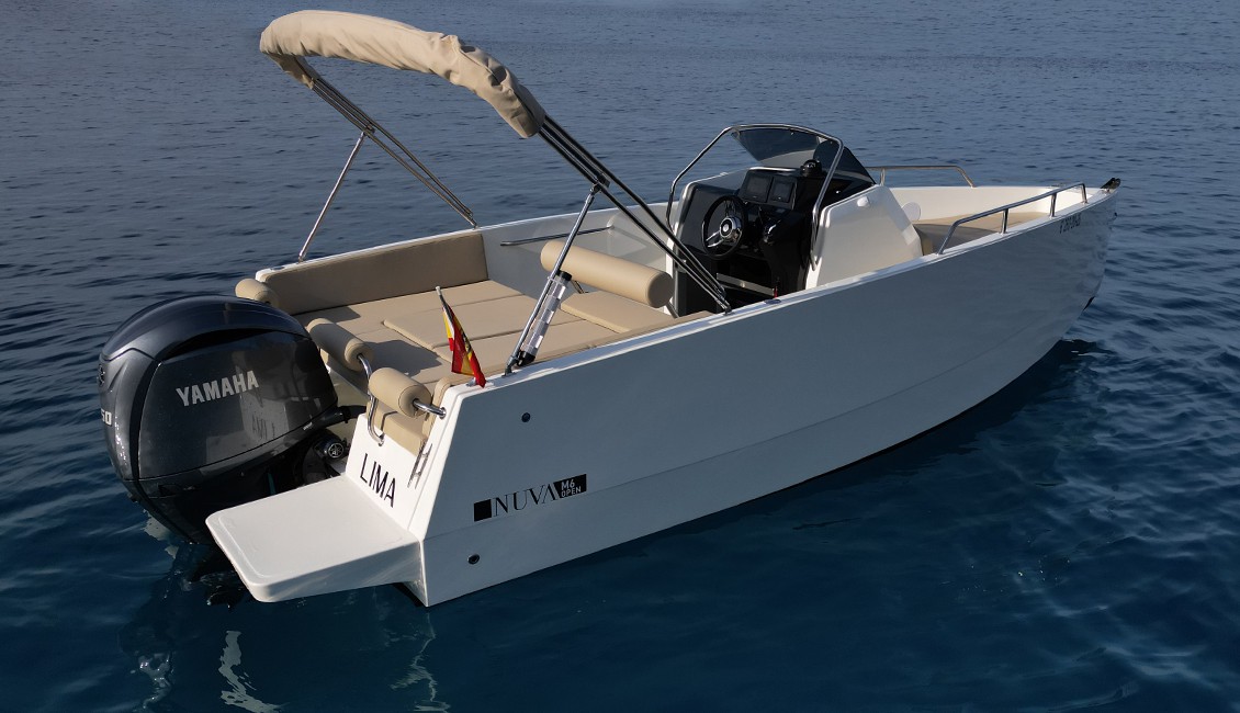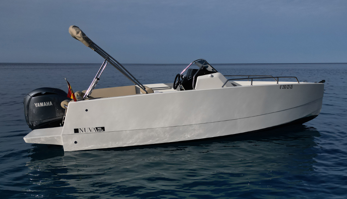 Nueva Nuva m6 open de 2025 con diseño minimalista y cubierta walk-around, es ideal para aquellos que buscan un día de navegación muy confortable. Presenta una amplia zona en proa dónde podrás navegar de forma segura, en la parte de popa dispone de un gran solarium para tomar el sol, también convertible en una mesa dónde podrán comer hasta 6 personas cómodamente.